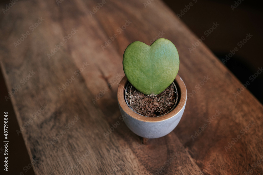 Beautiful Hoya kerrii leaf in a pot. heart shaped succulent plant on wooden background with copy space. Ornamental love decor and gift.