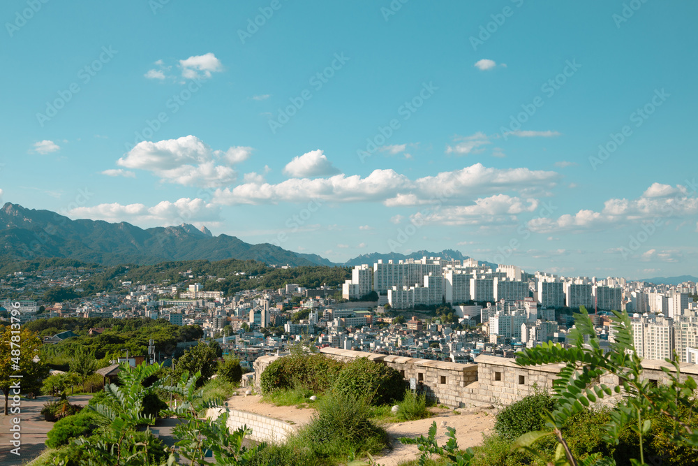Panoramic view of Naksan Park fortress and mountain and Seongbuk-gu downtown in Seoul, Korea