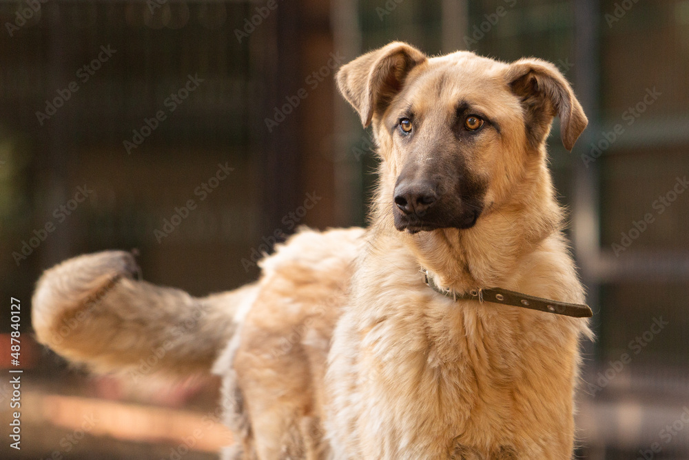Portrait of a big red mongrel dog in a shelter for stray dogs