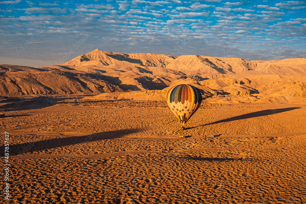 View of a single hot air balloon in luxor egypt landing in a random spot at the end of the ride. Many people arent aware that balloons actually land in random spots where wind carries them