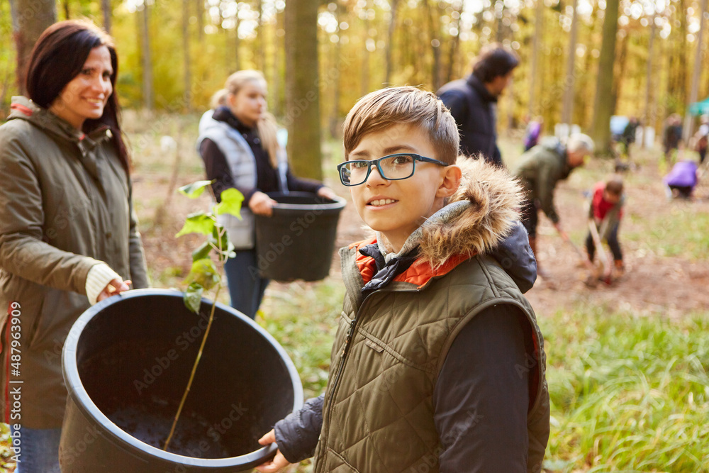Kleiner Junge hilft Familie beim Baum pflanzen im Wald