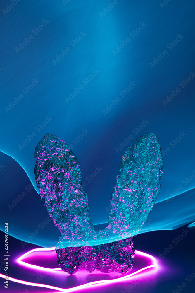 Easter bunny aluminum foil ears with pink and blue neon lights. Cyberpunk holiday background.