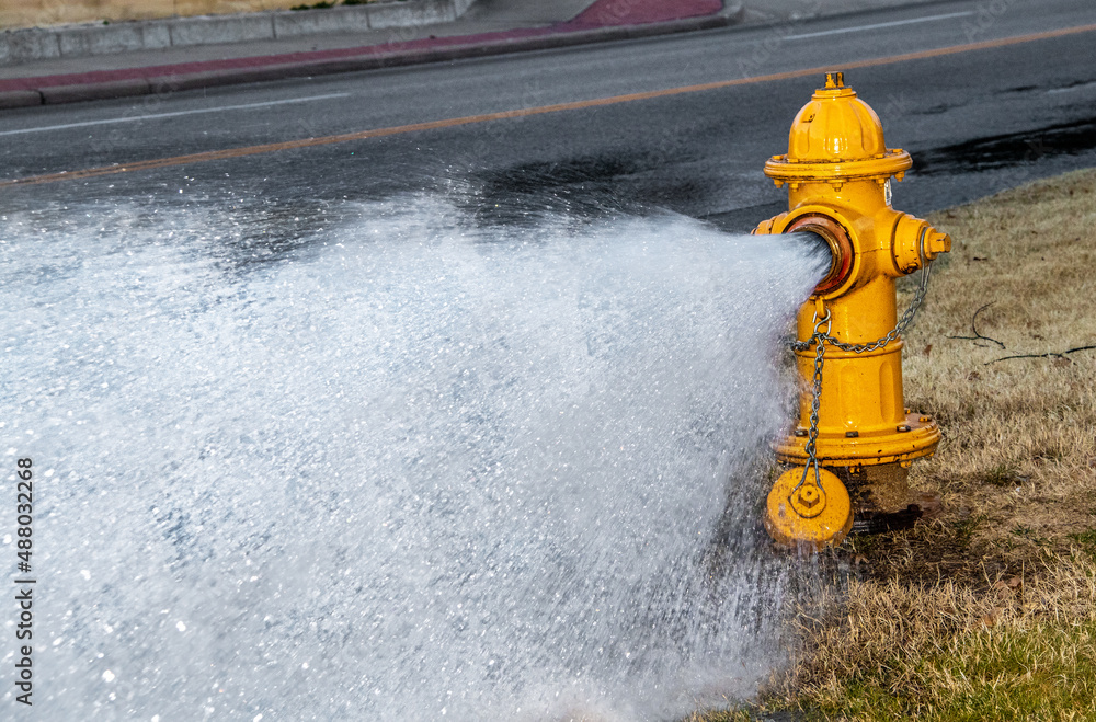 Yellow fire hydrant by four-lane street gushing water on a winter day