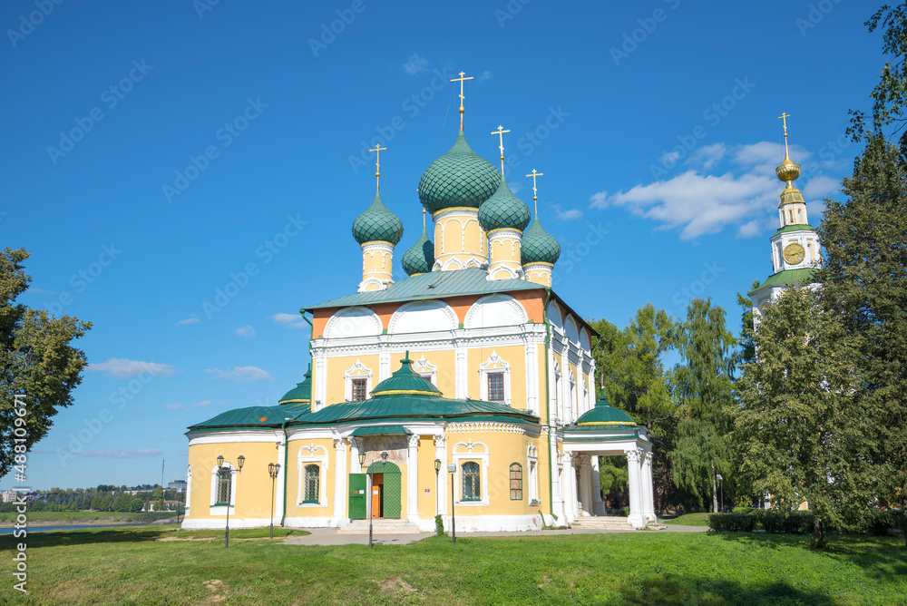 Ancient Transfiguration Cathedral on a sunny August day. The territory of the Uglich Kremlin. Golden Ring of Russia