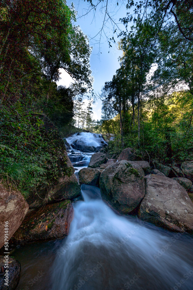 Adult student reading a book in the college library. Young positive male wearing glasses with bookshelves on background.