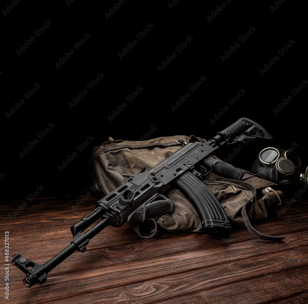 Soviet carbine in modern body kit. Weapons of Russia and the Soviet Union. Classic Soviet AK assault rifle and gas mask on a wooden back