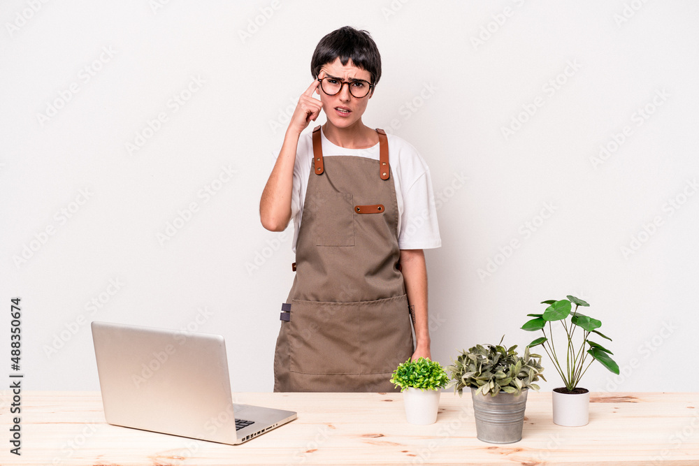 Young gardener woman isolated on white background showing a disappointment gesture with forefinger.