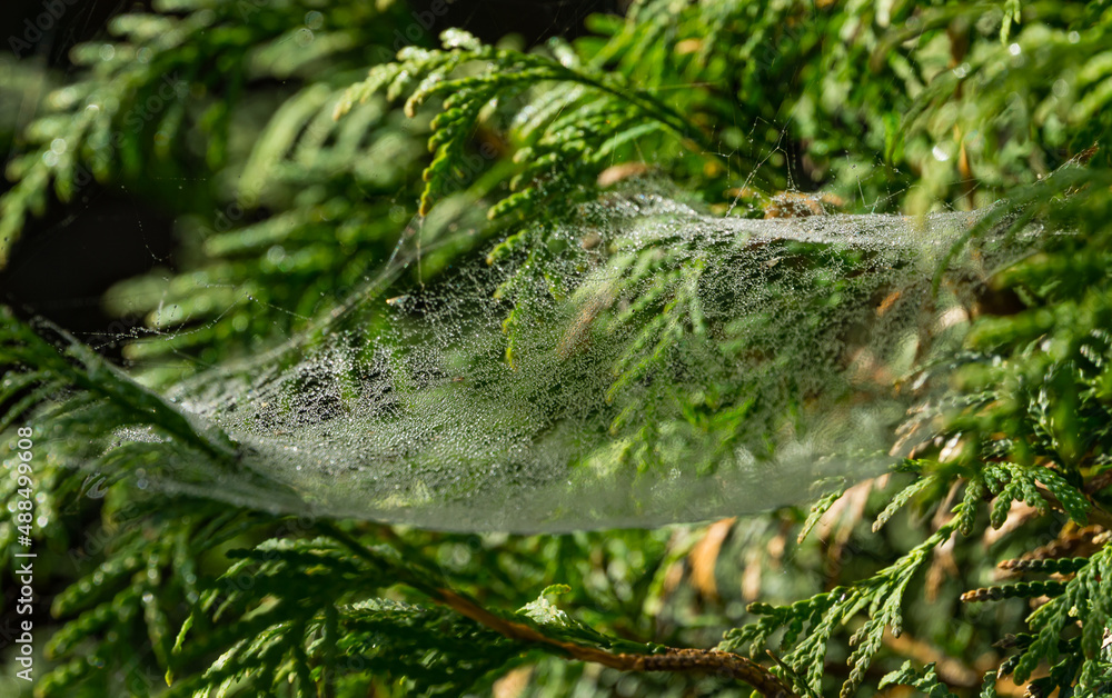 Graceful cobweb or spiderweb with morning dew between green branches of Thuja occidentalis, also known as northern white cedar.