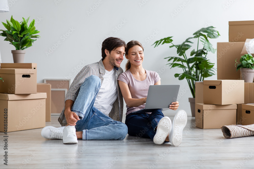Glad millennial caucasian family in casual searching ideas for new interior on computer, sits among cardboard boxes