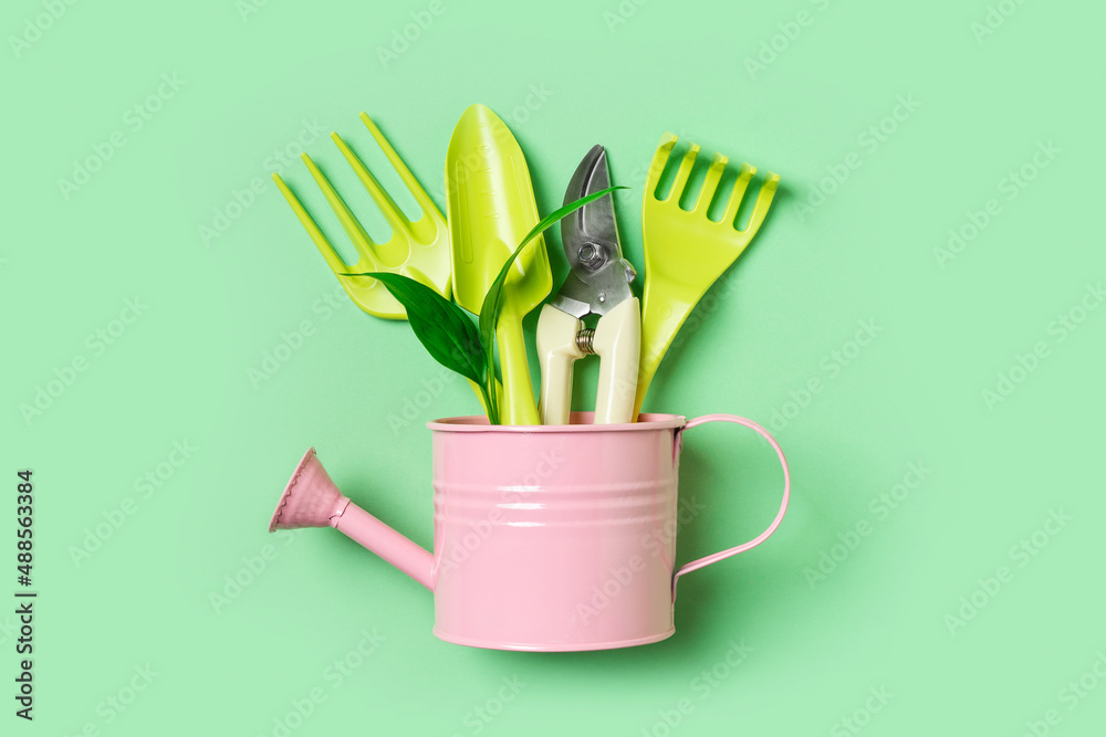 Growth and gardening creative concept with colors tools on green background,