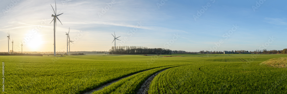Landscape with wind turbines, green fields and an agricultural silo and a settlement in the background. Panorama of windmills, agricultural factory, green field in the countryside in spring.