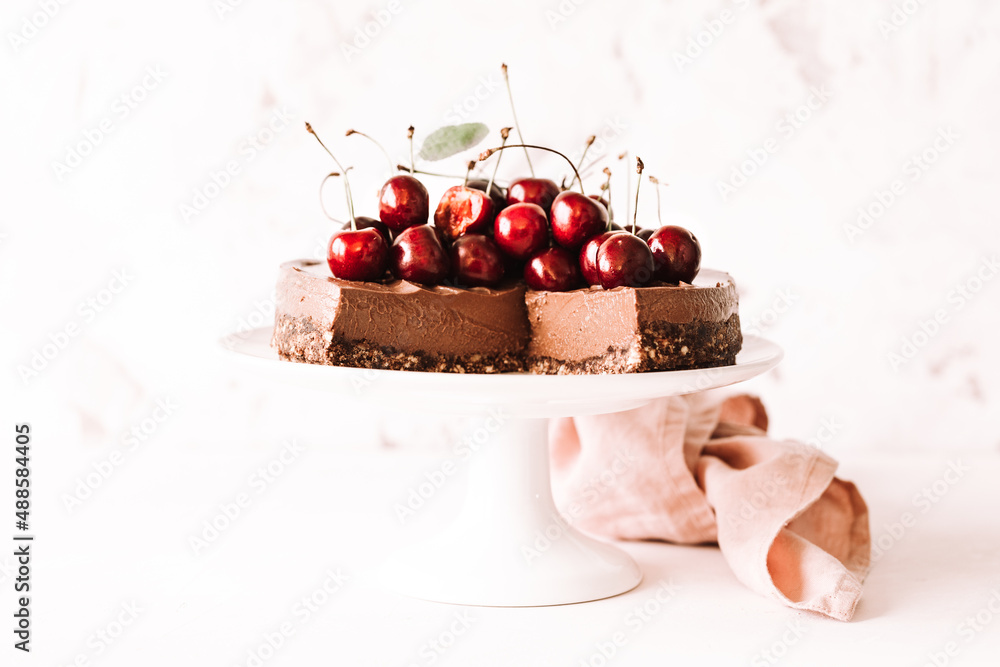 No Bake Chocolate Cheesecake Decorated with Fresh cherries and Mint, copy space for your text.