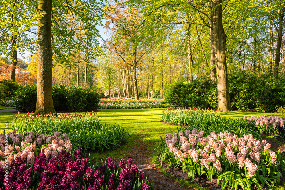 Keukenhof royal garden in spring, scenic view of sunny park with different flowers and bright green grass and blossoming trees, beautiful landscape, outdoor travel and botanical background, Netherland