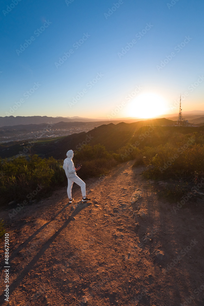 person looking on the sunrise. Hiking