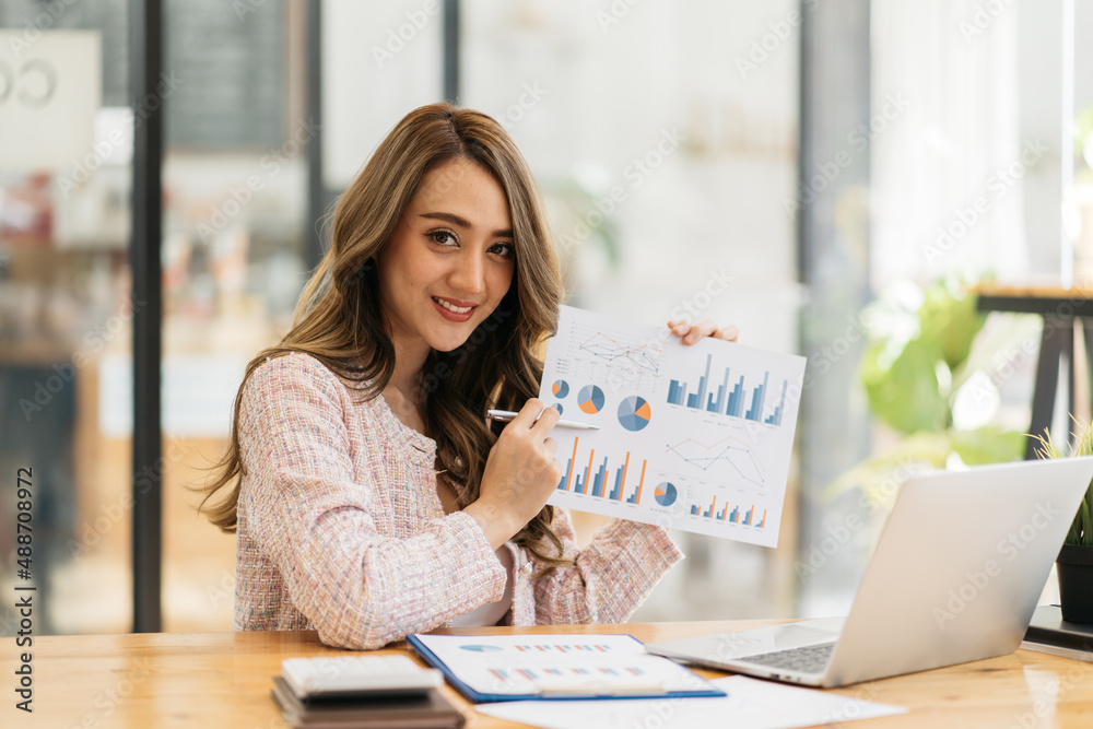business woman talking about sale report in video conference. Asian team using laptop and tablet online meeting in video call.Working from home, Working remotely and Social isolation.