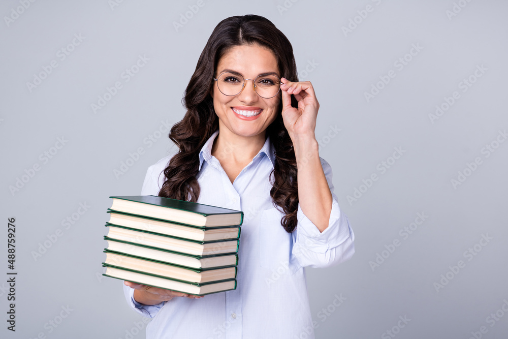Photo of confident positive clever lady hold stack book wear eyewear blue shirt isolated grey color background
