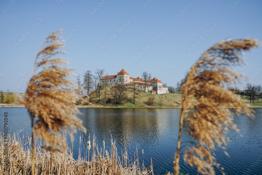 River reed close up on a background of mountains with an ancient castle. Dried flower in the foreground on a background of blue river on a spring day.