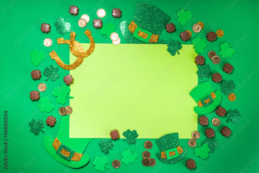 St Patrick flatlay background with shamrock clover leaves, leprechaun hat decor, golden coins and chocolates in form of symbol of st. patrick day