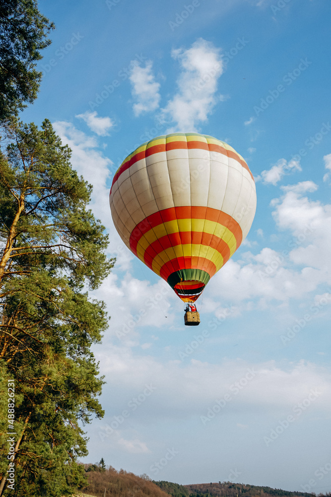 The white and yellow balloon rises. Colored balloon with basket on sky background. Air sports. Family vacation in cloudless weather.
