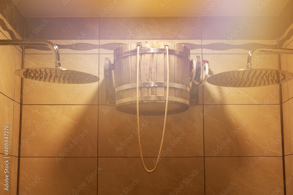 Wooden bucket with cold water for dousing after sauna and bath, hot bath