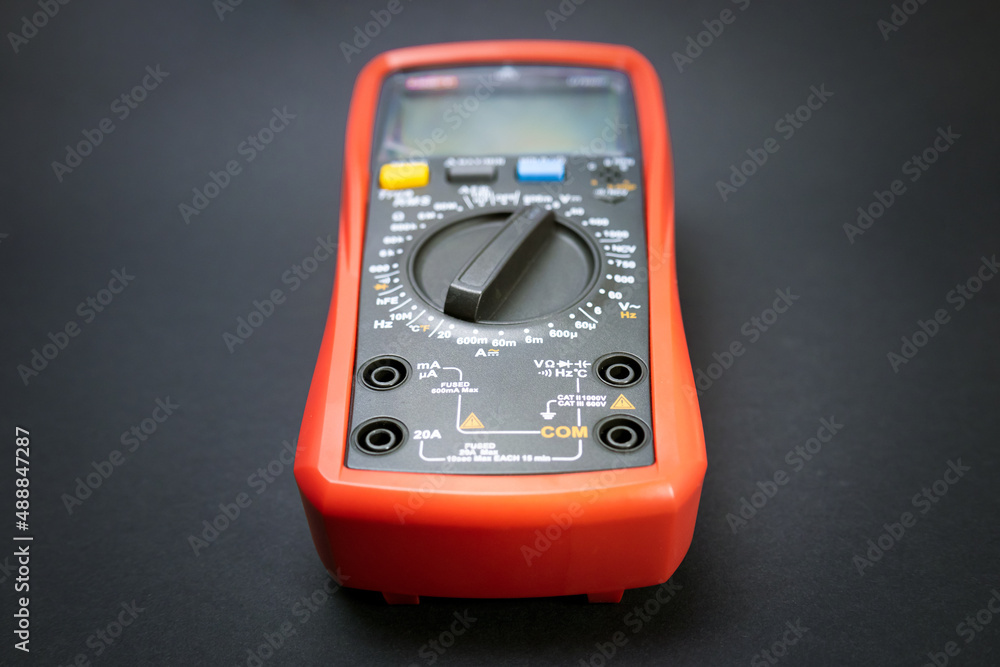 Red multimeter, multimeter or multitester, modern multifunctional voltage measuring instrument on dark background
