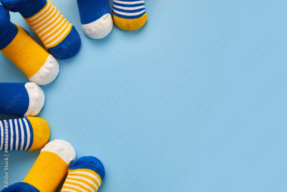 World Down syndrome day background. Down syndrome awareness concept. Socks on blue background