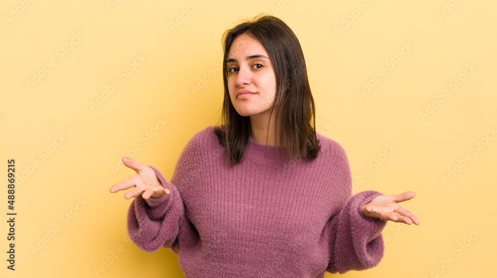 young hispanic woman feeling clueless and confused, having no idea, absolutely puzzled with a dumb or foolish look