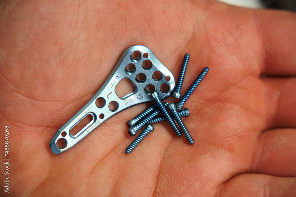 explanted surgical blue titanium radius plate lies in one hand