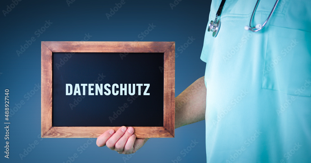 Elektronische Datenschutz (Patientendaten). Arzt zeigt Schild/Tafel mit Holz Rahmen. Hintergrund blau