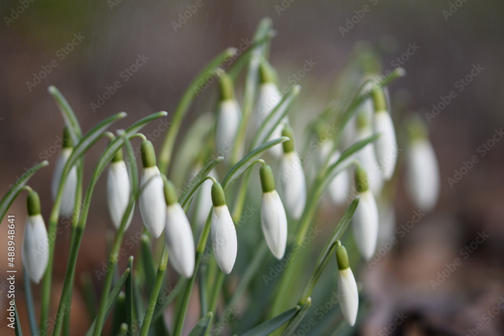 Early spring flowers white snowdrops closeup, bokeh garden background, spring awakening.