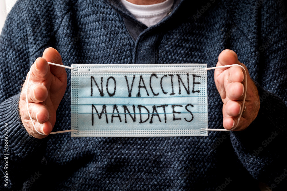 The man does not agree to do covid-19 vaccination, Put on text message "No vaccine mandates" on medical mask as a stop sign for no vaccine injection. Anti-vaccination campaigns.