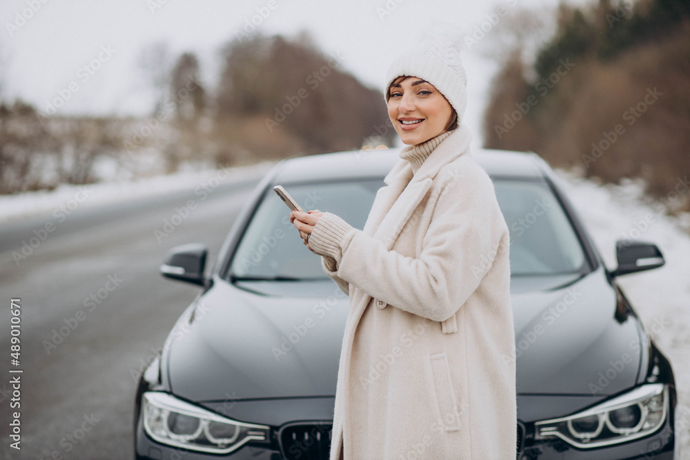 Woman talking on the phone by her car on the road in winter forest