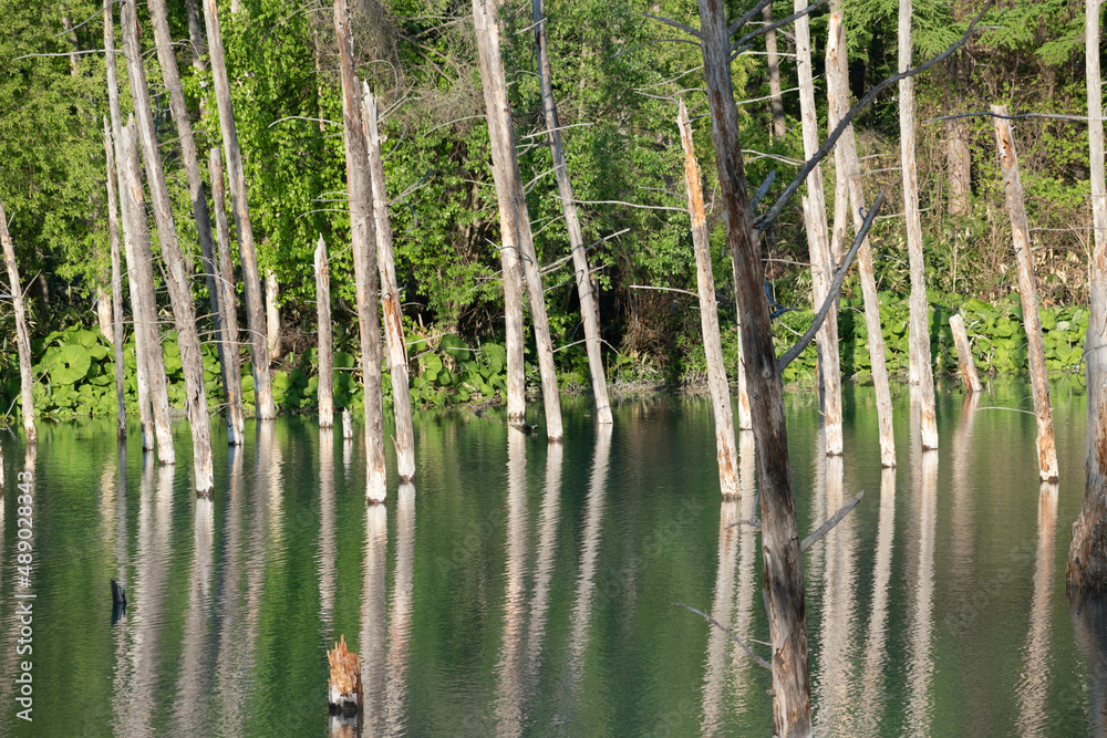 水面に古木を映す初夏の青い池 美瑛町