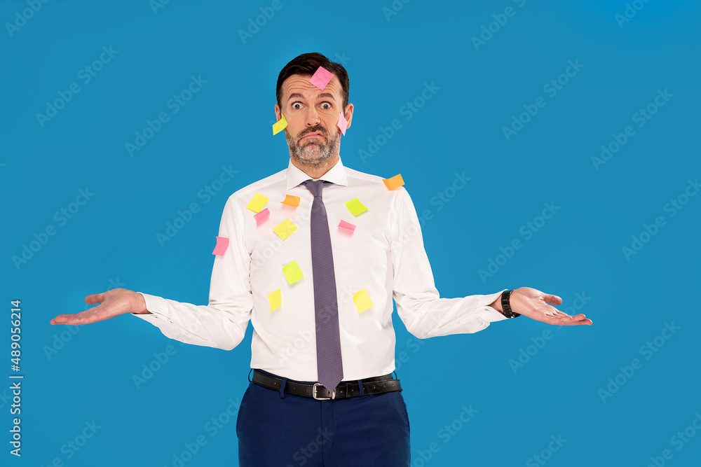 Tired male businessman in formal clothes posing over blue studio background, a lot of stickers on his body. Worker.
