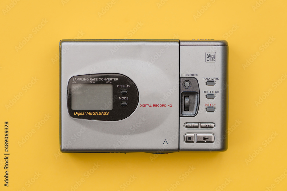 Mini Disc player from the 1990's. Top down view with yellow background.
