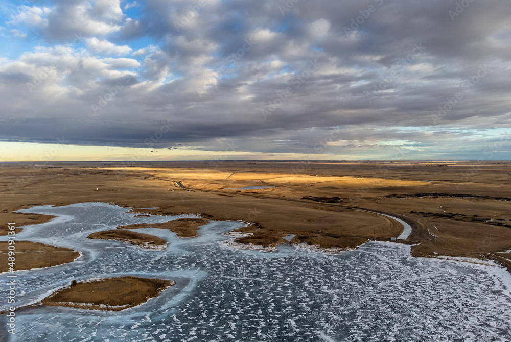 Aerial view of large cracks across Crawling Valley Reservoir and frozen tundra during winter in Alberta Canada.