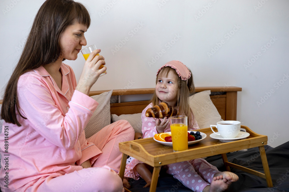 Beautiful young woman with a little cute girl spend time together at home, sitting on the bed.