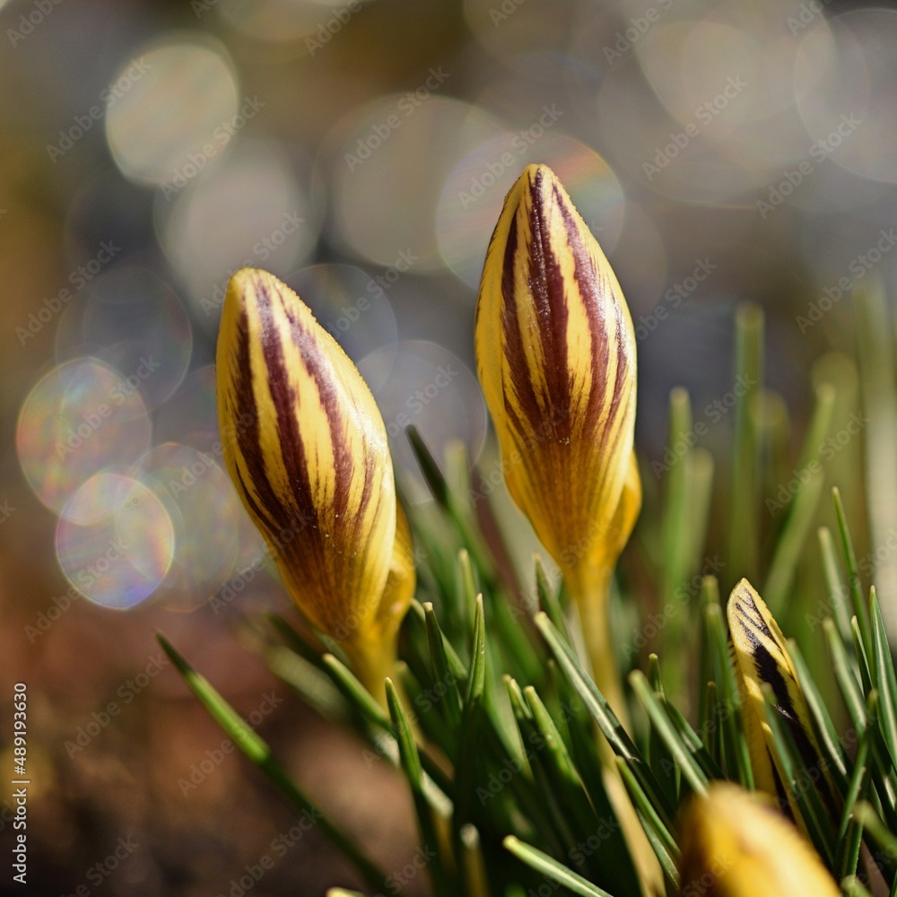 Crocus chrysanthus 'gipsy girl', snow crocus variety gipsy girl, flower buds in early spring garden, flower crocus closeup with bokeh lights.