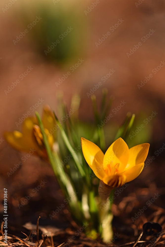 Blooming crocus chrysanthus, snow crocus first spring flowers, flowers in early spring garden, flower crocus closeup.