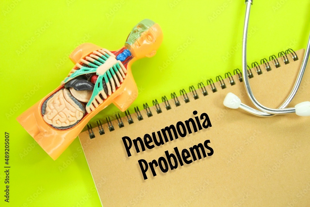 internal organs of the human body, stethoscopes and notebooks with the word pneumonia problems