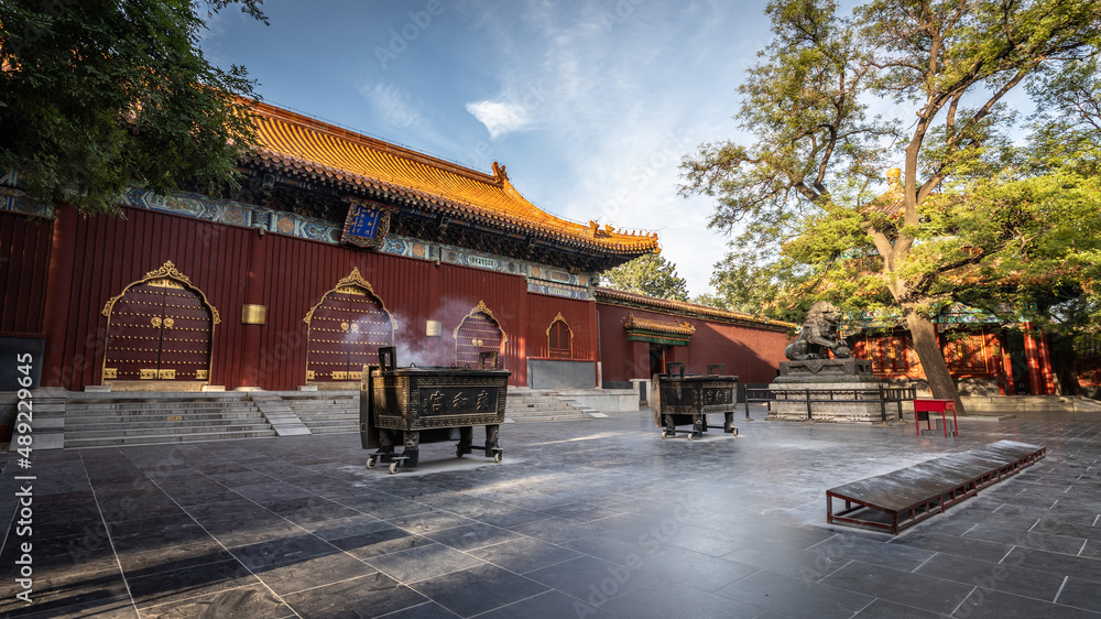 Zwei große Bronzetruhen mit aufsteigendem Weihrauch vor einem roten, traditionellen Gebäude mit orangenen Dachziegeln des chinesischen Lama Tempels in Peking