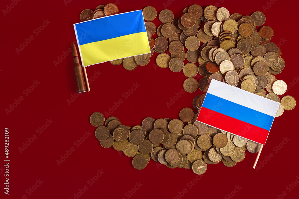 Russian and Ukrainian flag with a live cartridge of a Kalashnikov assault rifle on Russian currency coins on a red background. The concept of military conflict between countries.