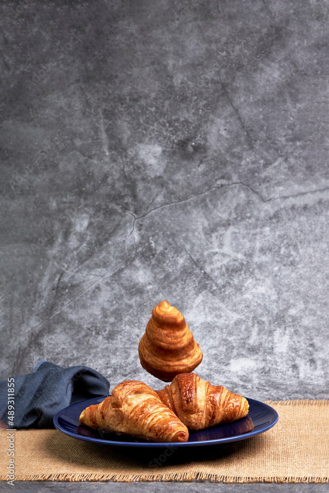 Group of croissants falling on a blue plate. Sweets and desserts