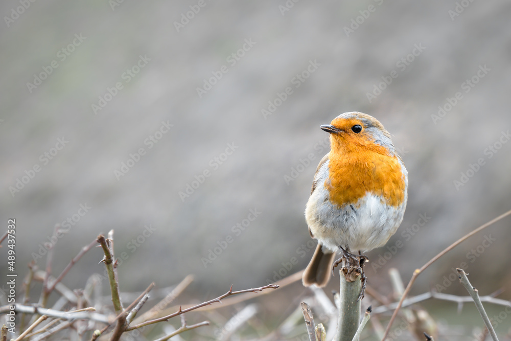 A lightly puffed up English robin redbreast with bright orange chest in profile facing left, perching on a bare hedge in winter - with copy space
