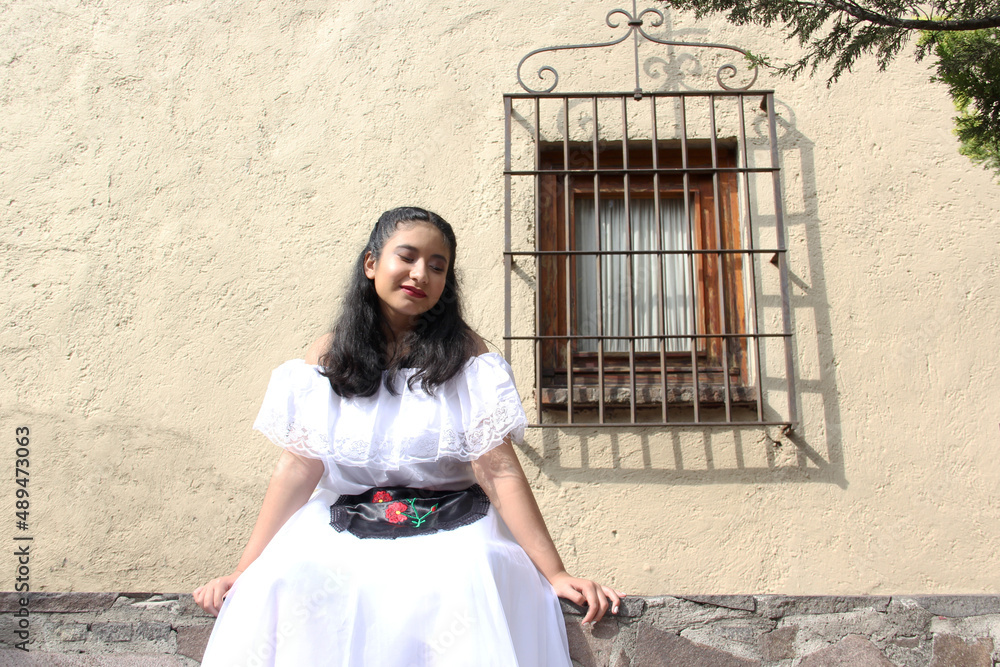 Young woman from Veracruz teenager wears a white regional Mexican dress very happy and proud of her tradition or culture in the colonial streets of Mexico