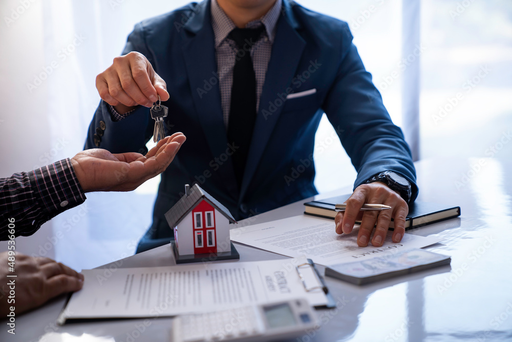 Real estate company to buy houses and land are delivering keys and houses to customers after agreeing to make a home purchase agreement and make a loan agreement. Discussion with a real estate agent