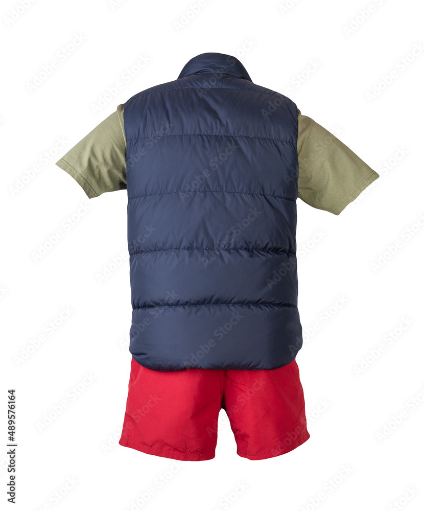 sleeveless jacket, t-shirt and sports shorts isolated on white background. Valid clothes for cool weather