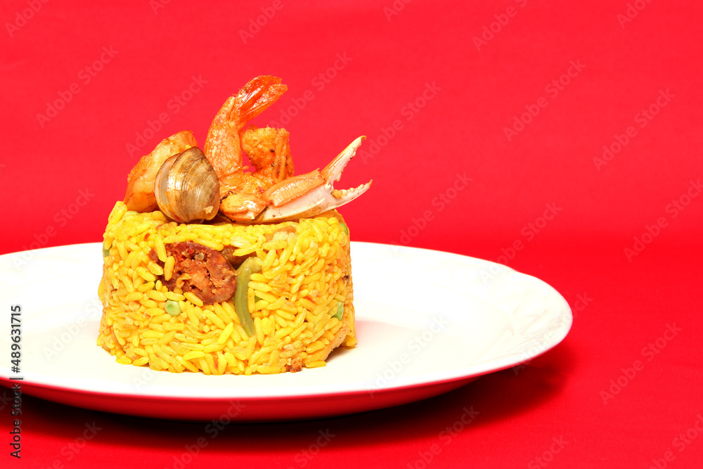 Arroz a la paella is a Spanish cuisine recipe made in a large pan with saffron, seafood such as shrimp, clam, sausage, chorizo on a white plate on a red background