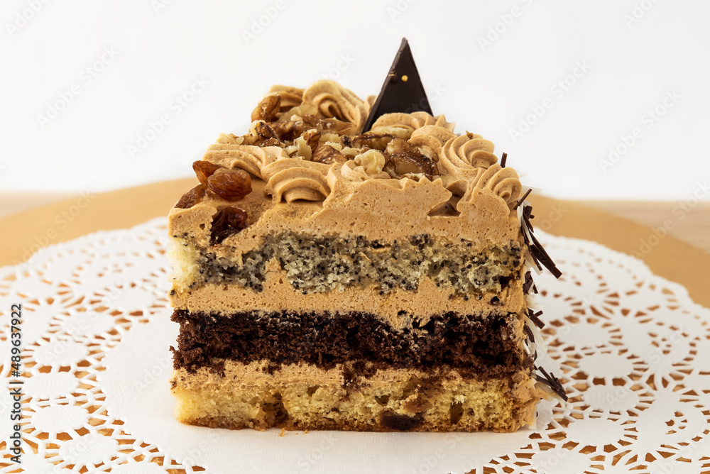 A whole chocolate cake covered with icing, decorated in the form of a flower, stands on a white stand on a wooden table.