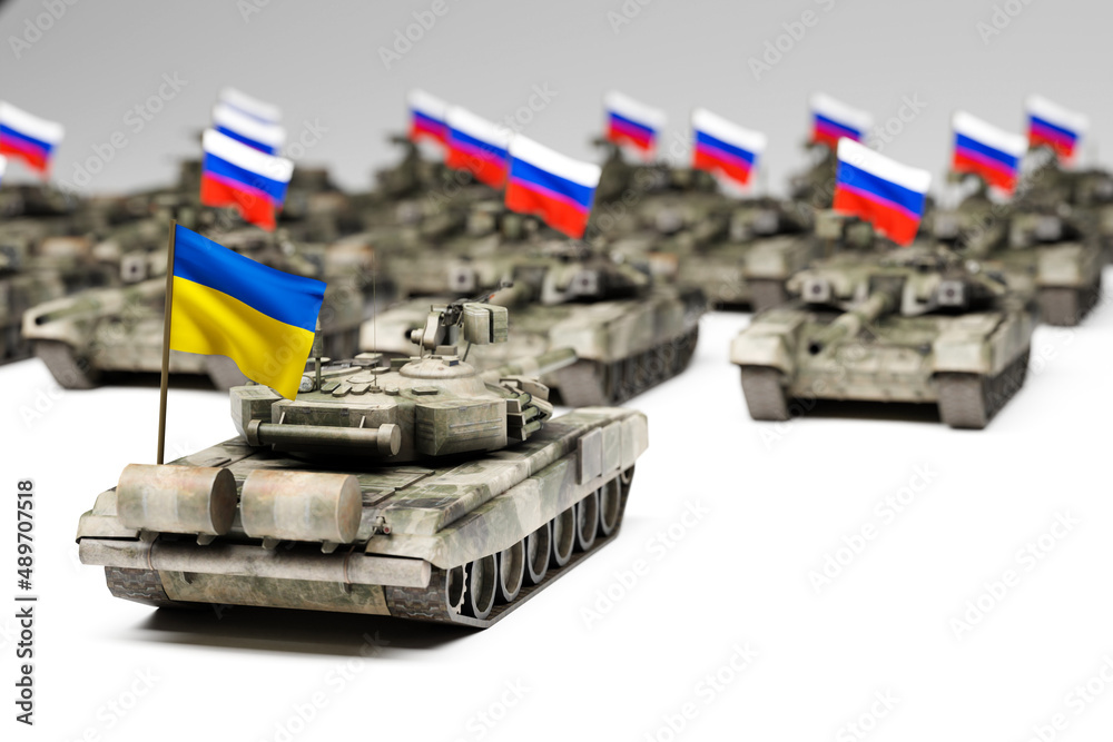 Russia and Ukraine Flags. War conflict concept. 3D Illustration